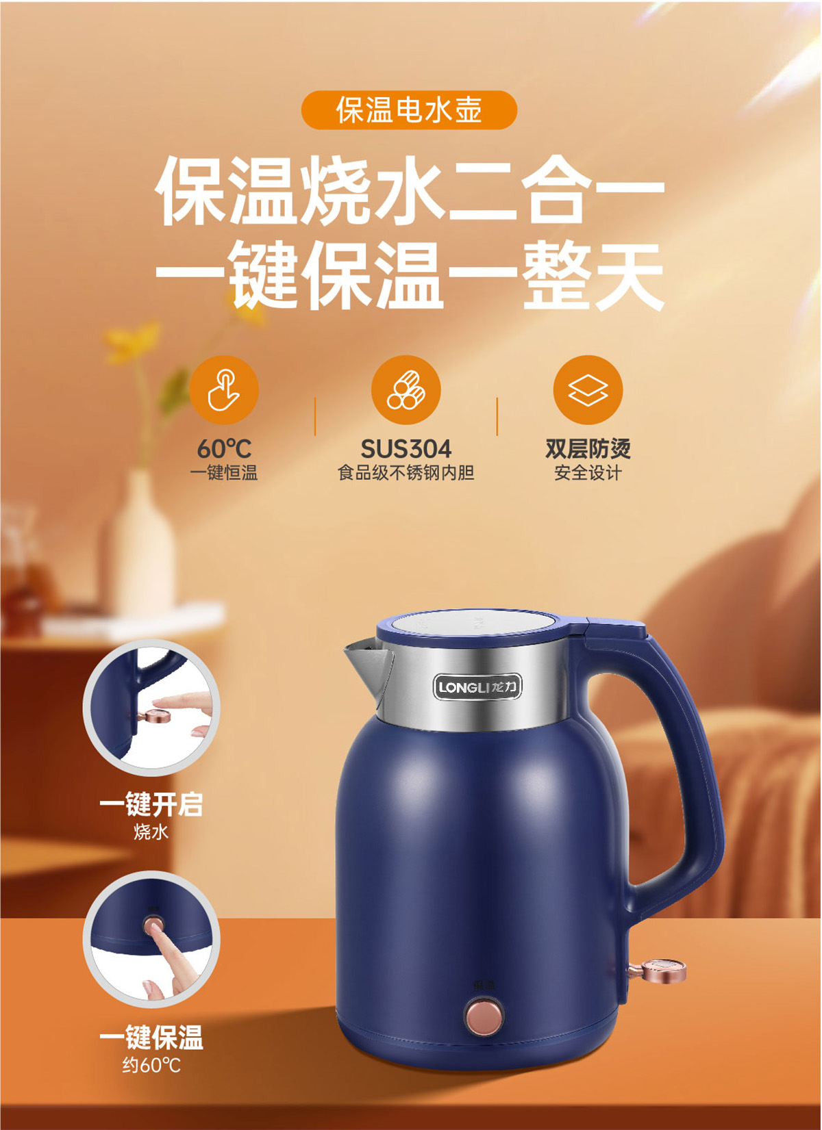 如果您覺得使用飲水機清理比較麻煩,不如試一試龍力8836電水壺吧!雙層防燙安全設(shè)計,外層采用高品質(zhì)耐高溫塑料,隔熱不燙手;食品級304不銹鋼內(nèi)膽,每一口都是放心水,無縫內(nèi)壁不易藏污納垢;使用進口溫控器,24小時長效保溫,喝水無需反復(fù)燒煮。