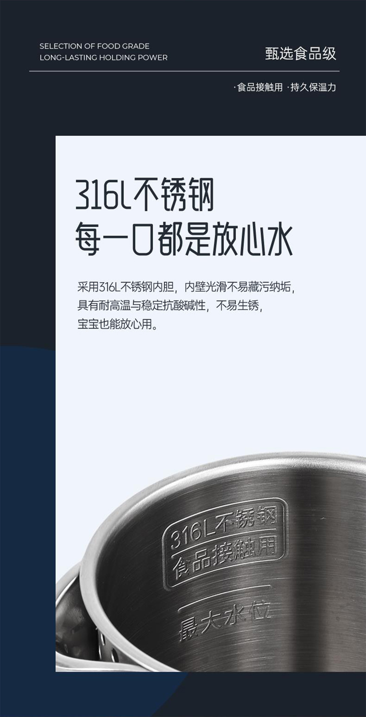 出游暢飲一口放心水這款便攜式旅行水壺采用316L不銹鋼內(nèi)膽,一體成型無縫內(nèi)膽,內(nèi)壁光滑不易藏污納垢,便于清洗,煮出健康無異味水。內(nèi)膽是食品級不銹鋼材質(zhì),具有耐高溫與穩(wěn)定抗酸堿性,不易生銹,寶寶也能放心用。