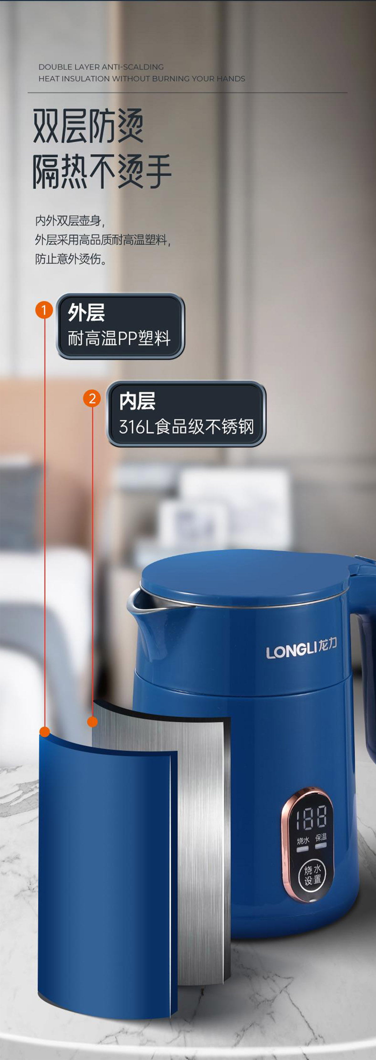 時刻呵護(hù)您的雙手便攜式水壺雖然體積小,但該有的功能與安全保障不能少。這款水壺?fù)碛袃?nèi)外雙層防燙壺身,外層采用耐高溫PP塑料,內(nèi)層316L食品級不銹鋼,雙重保障,沸騰時不燙手,觸摸更安全。