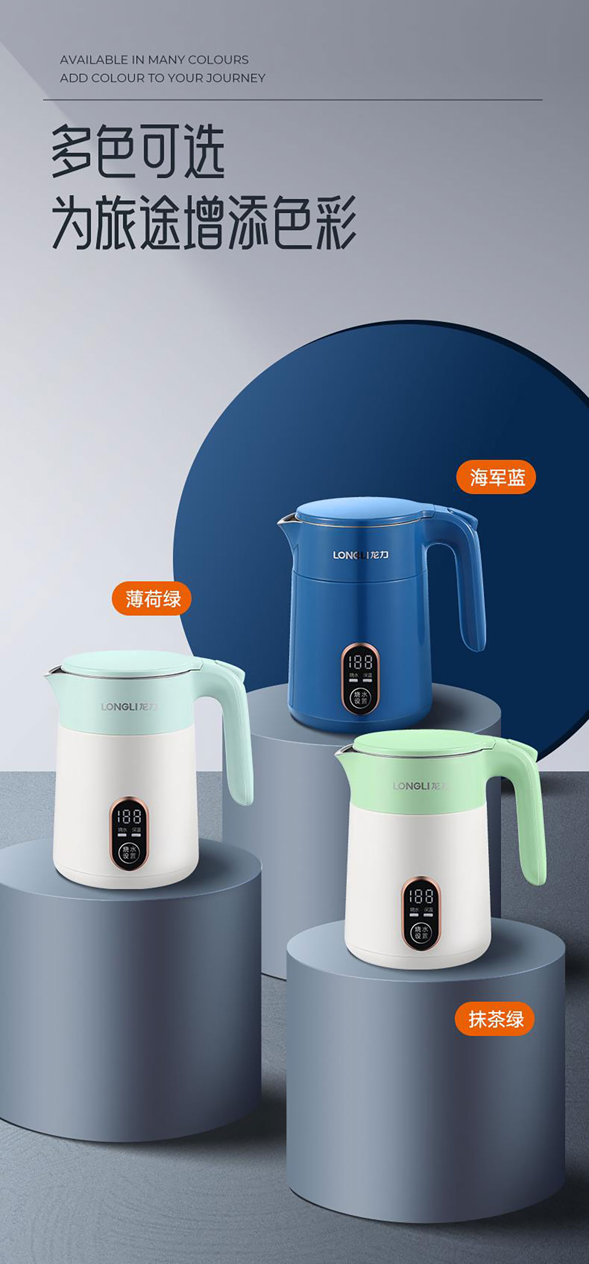 喝水要有儀式感我們深入研究了消費市場廣受歡迎的產(chǎn)品配色,最終選用了以下三種:薄荷綠清新,抹茶綠淡雅,海軍藍(lán)硬朗,為出行增添更多色彩。壺身光滑,時刻保持亮麗如新;V型濾網(wǎng)壺嘴,出水暢快利落;插座與底座采用了防水防滑的硅膠材質(zhì),有效防止水分進(jìn)入。種種設(shè)計細(xì)節(jié),彰顯出龍力水壺的貼心與精致。