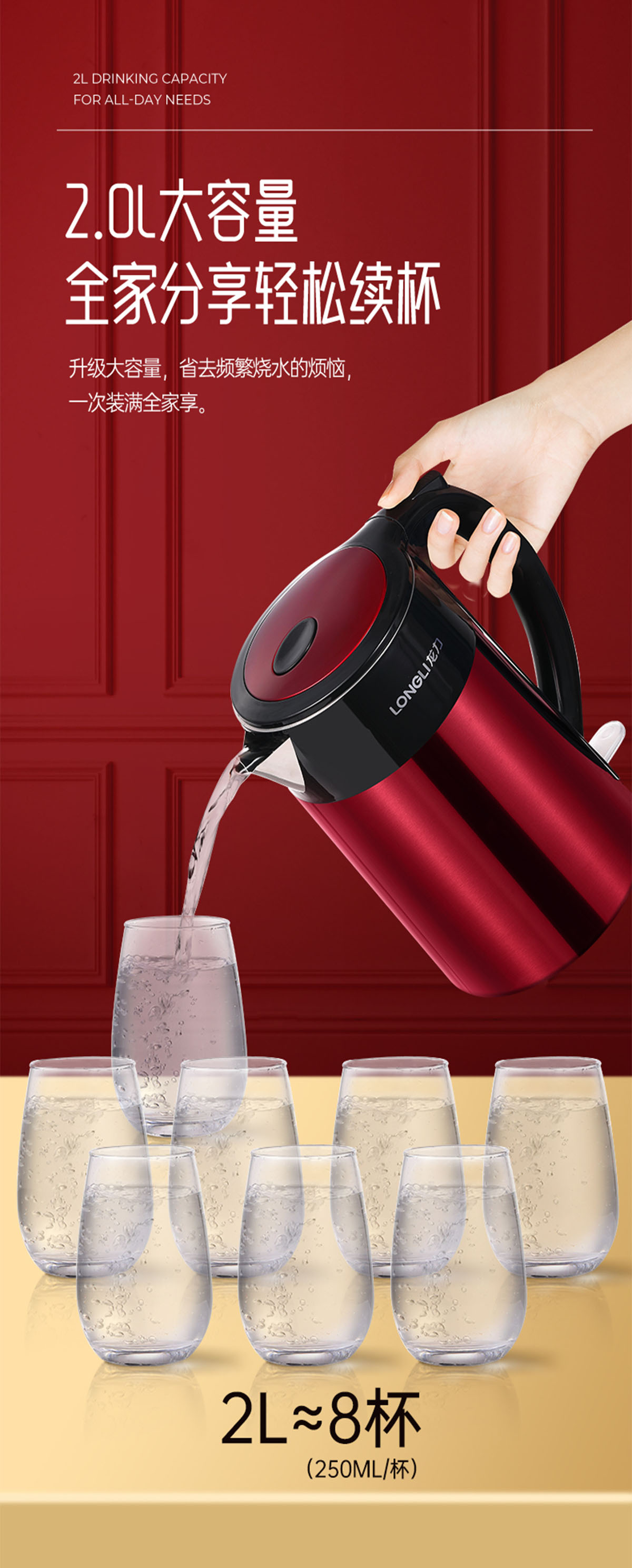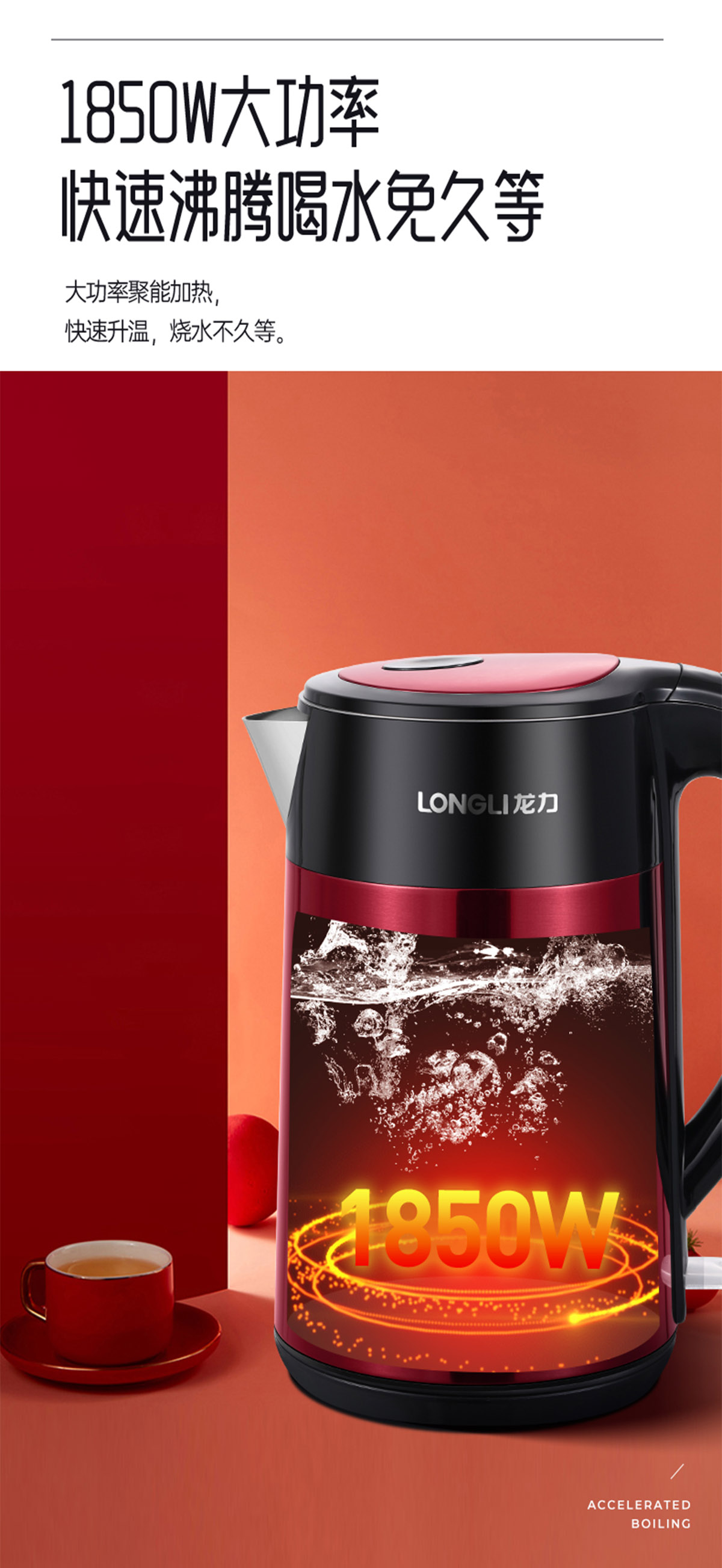 只要輕輕按下燒水鍵就可以燒水啦,1850W澎湃功率,快速聚能加熱,想喝就喝,隨時隨地喝上暖呼呼的熱飲;2L大容量不論大小家庭都不在話下,一次裝滿全家共享,無需頻繁加水燒水!