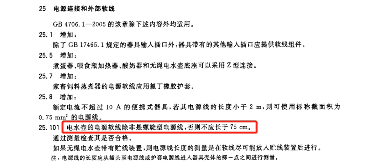 國家標準要遵循根據GB 4706.19-2008《家用和類似用途電器的安全 液體加熱器的特殊要求》規定,電水壺的電源軟線除非是螺旋型電源線,否則不應長于75cm。