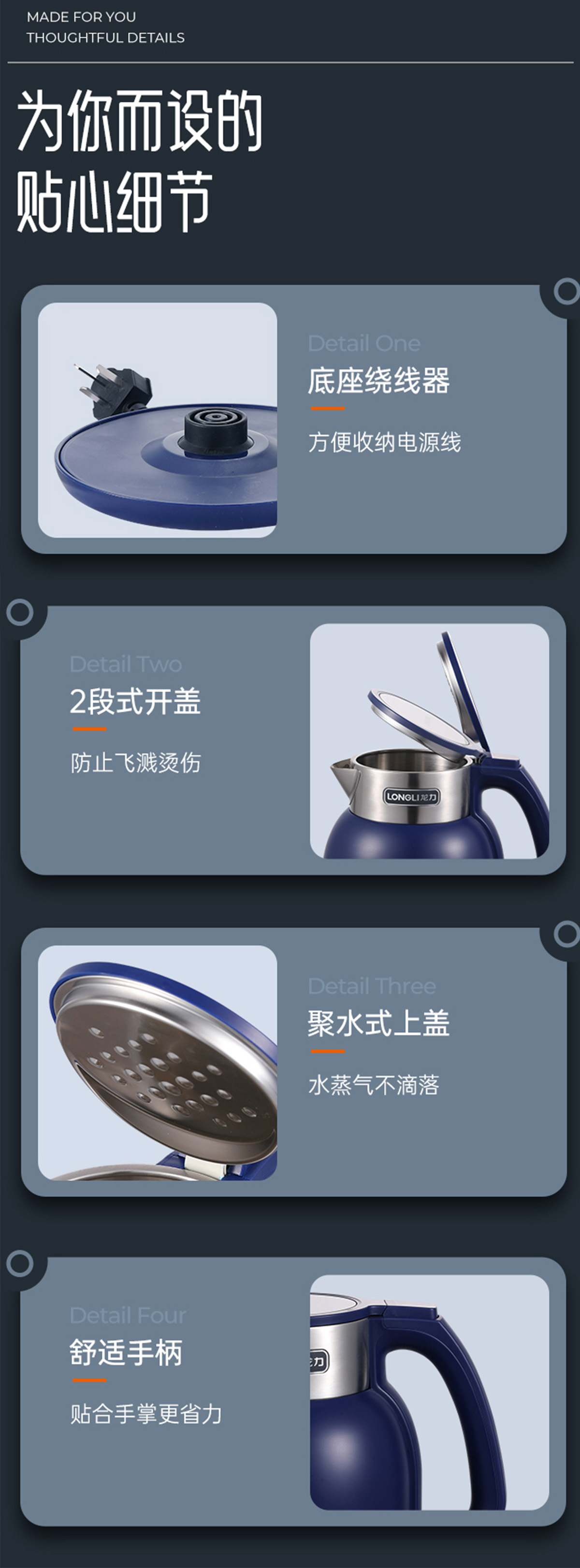 龍力設身處地為用戶考慮了多重使用安全性,在生產電水壺時,處處貼心細節都為用戶您而設。底座繞線器設計,方便用戶收納電源線,省空間防絆倒;兩段式開蓋,防止蒸汽飛濺燙傷,呵護您的雙手;弧形舒適手柄,貼合手掌更省力,牢牢拿緊不易摔。除此之外,龍力8836電水壺還采用了進口溫控器,精準控溫防干燒,無水自動斷電,24小時長效保溫,家有老人小孩使用舒心又安心!